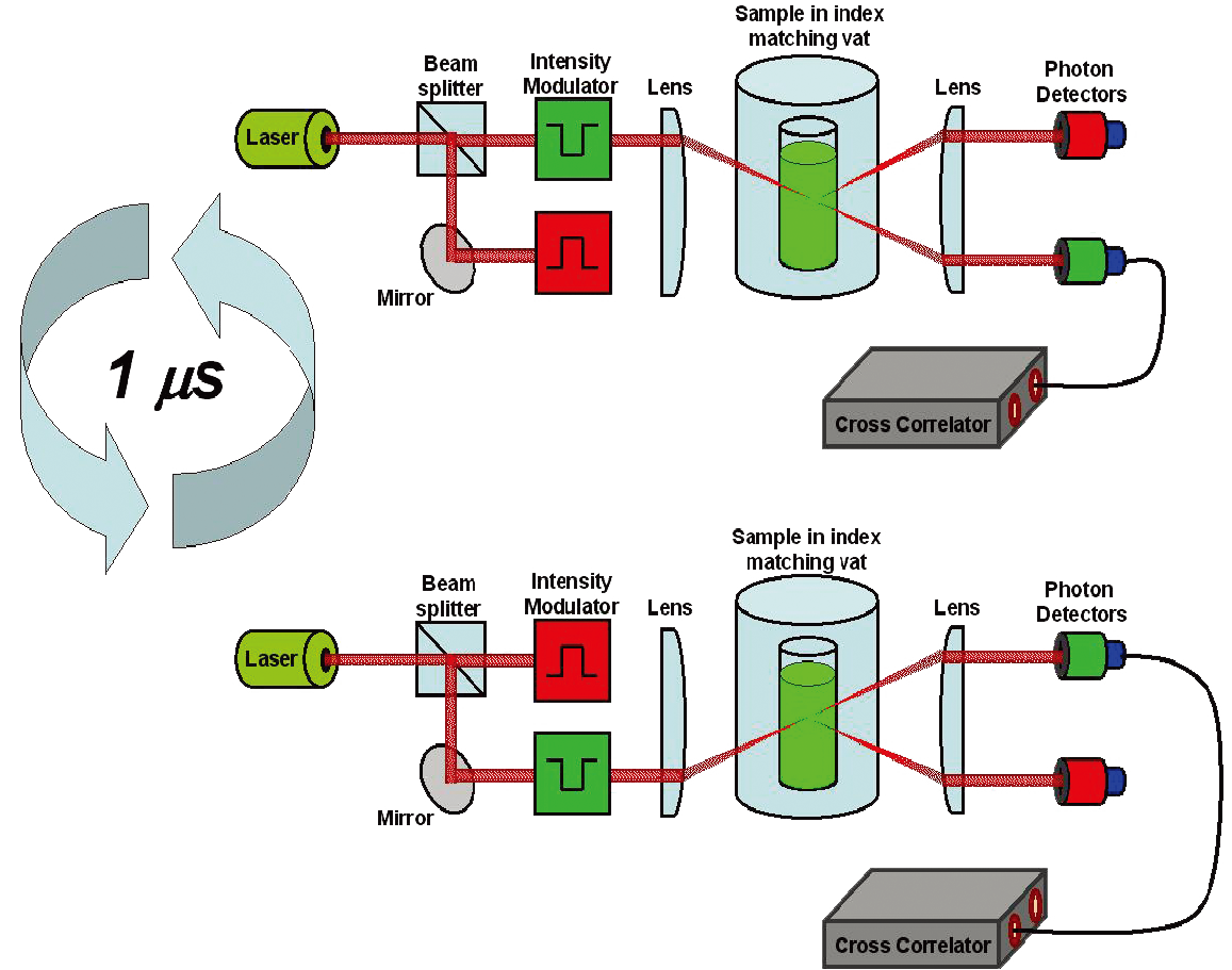 暫時(shí)性隔離每一光束-檢測(cè)器對(duì),避免檢測(cè)器間的串?dāng)_和信號(hào)損失。入射光由控制器選擇性輸入,檢測(cè)器輸出在頻率(標(biāo)準(zhǔn)的調(diào)制頻率 500 kHz ? 2μs 的時(shí)間分辨率)超過(guò)系統(tǒng)動(dòng)力學(xué)的時(shí)間尺度上被電子門(mén)控。門(mén)控輸出信號(hào)在等于或大于調(diào)制周期的時(shí)間標(biāo)度里被互相關(guān),從而得到精準(zhǔn)的互相關(guān)函數(shù)。