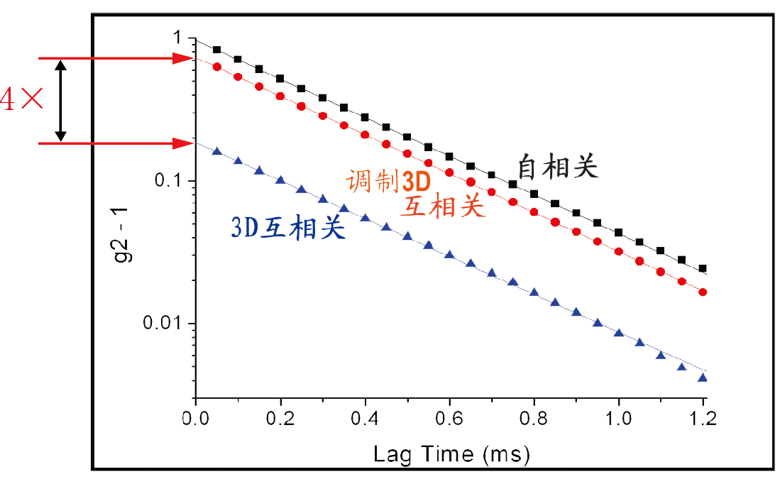 三維互相關(guān)技術(shù)采用兩組同時(shí)進(jìn)行的光散射實(shí)驗(yàn)對(duì)同一散射矢量同一樣本體積進(jìn)行測(cè)試,由于平行試驗(yàn)的兩個(gè)檢測(cè)器之間的信號(hào)會(huì)存在串?dāng)_,所以三維光散射技術(shù)相對(duì)于傳統(tǒng)的自相關(guān)或準(zhǔn)互相關(guān)光散射技術(shù),再其展現(xiàn)“較高濃度測(cè)試上限”優(yōu)勢(shì)的同時(shí),背后也存在著“先天不足”,其信噪比差,體現(xiàn)在光強(qiáng)相關(guān)函數(shù)的截距理論值卻只有0.2,所以在面臨一些弱散射體系時(shí)就會(huì)陷入困境。