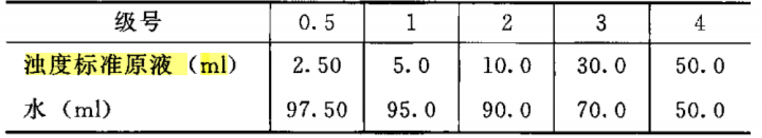 濁度標準液的制備:取濁度標準原液與水,按下表配制,即得。