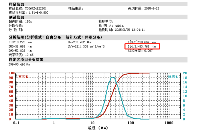 激光粒度儀采用D [4,3](體積加權平均粒徑),結果為33.762μm;