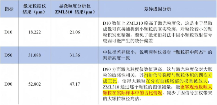 差異源于統計權重:激光粒度儀的 D [4,3] 是對 “體積四次方加權” 的整體平均(大顆粒權重更高),而 ZML310 是對統計到的近萬個顆粒的 “體積直接平均”,顆粒統計數量與權重分配的差異導致了微小偏差。