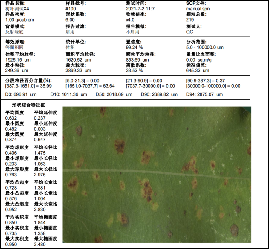 第三步:軟件對(duì)掃描后的葉片圖片進(jìn)行面積分析,分析出斑點(diǎn)的情況分布,還可以按照病斑的大小做粒度分布,并給出D10、D50、D90等參數(shù);