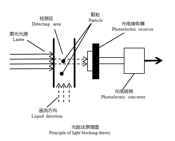 當液體中的微粒通過一窄小的檢測區時,與液體流向垂直的入射光,由于被不溶性微粒所阻擋,從而使傳感器輸出信號變化,這種信號變化與微粒的截面積成正比,光阻法檢查注射液中不溶性微粒即依據此原理,光阻法的工作方式是在光源和檢測器之間讓稀釋的顆粒懸浮液體通過。