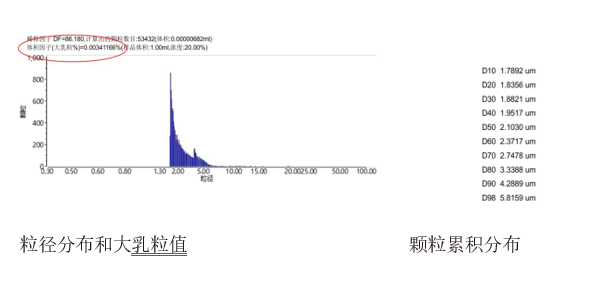 大乳粒分析儀是采用光阻法原理設計生產的顆粒計數器,其主要的功能是用來測試注射型乳劑,如脂肪乳等。用來表征乳劑中乳滴粒徑在5μm至50μm之間的乳滴總體積與乳劑中油相總體積的比值。《USP729》和《中國藥典》中對乳劑大乳粒的測試做了明確的規定,ZM-02型號產品符合藥典中的要求。還可以應用于測試微泡體積,造影劑等產品,符合《中國藥典》0982章節第四法中粒度分布檢測要求,可以用來檢測氣泡濃度。